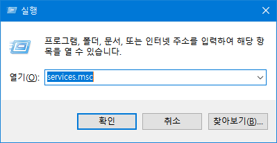 '윈도우 키 + R' 키를 눌러 실행 창을 열고, 'services.msc'를 입력하고 하단의 확인 버튼 또는 엔터 키를 눌러 서비스 창을 실행합니다.