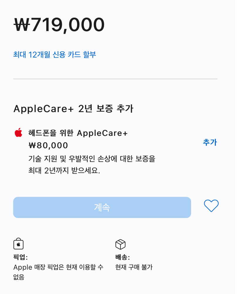 에어팟 맥스의 가격은 719,000원으로 구성되어 있습니다. 선택에 따른 추가 금액 결제는 없고, 헤드폰을 위한 AppleCare + 는 80,000원입니다.