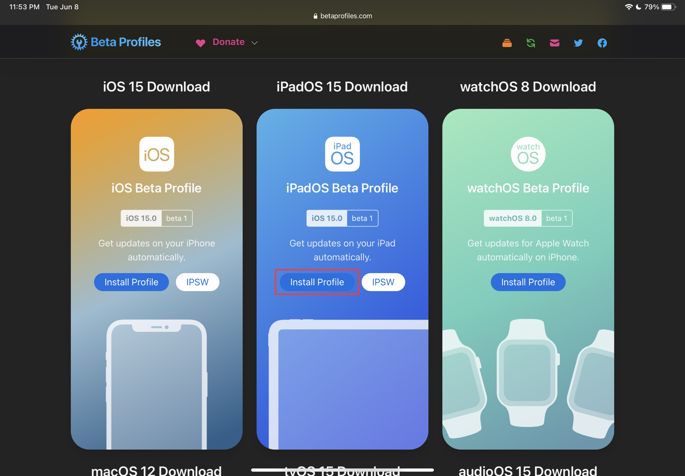 여기를 클릭하여 베타 프로파일을 다운로드 받는 웹 페이지에 방문하거나, 아래 링크를 클릭하여 방문하여 'iPadOS 15 Download'에서, 'Install Profile' 버튼을 클릭합니다. 그 후, 'Install beta profile?' 경고창이 나타난다면, 'Install Anyway!' 버튼을 클릭하여 다운로드를 계속 진행합니다.