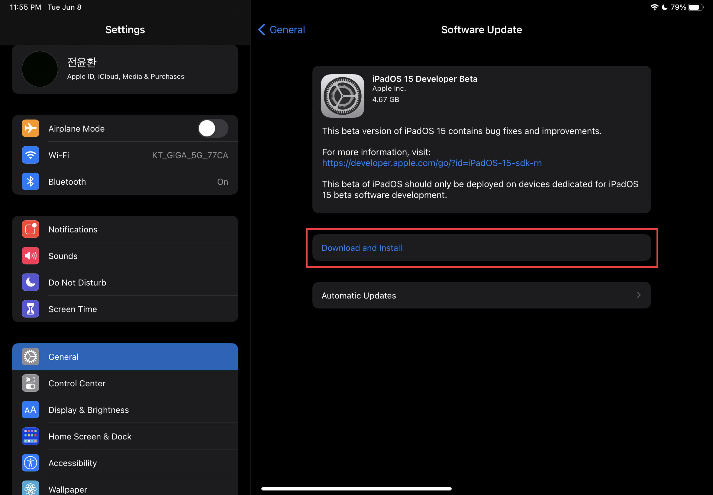 아이패드가 재시동 되었다면, 이제 소프트웨어 업데이트를 통해 베타 버전을 다운로드하고 설치할 수 있습니다. 다시 설정 앱을 열고, 소프트웨어 업데이트 메뉴에 들어갑니다. 그러면 'iPadOS 15 Developer Beta' 버전이 나오고, 아래에 '다운로드 및 설치' 또는 'Download and Install' 버튼이 표시됩니다. 이 버튼을 눌러 베타 버전 다운로드가 완료됩니다. 빠른 다운로드를 위해서 빠른 네트워크에 연결하시는게 좋습니다. 만약 많은 사용자가 베타 버전을 다운로드하게 된다면 진행 시간이 증가될 수 있으니 주의하세요.