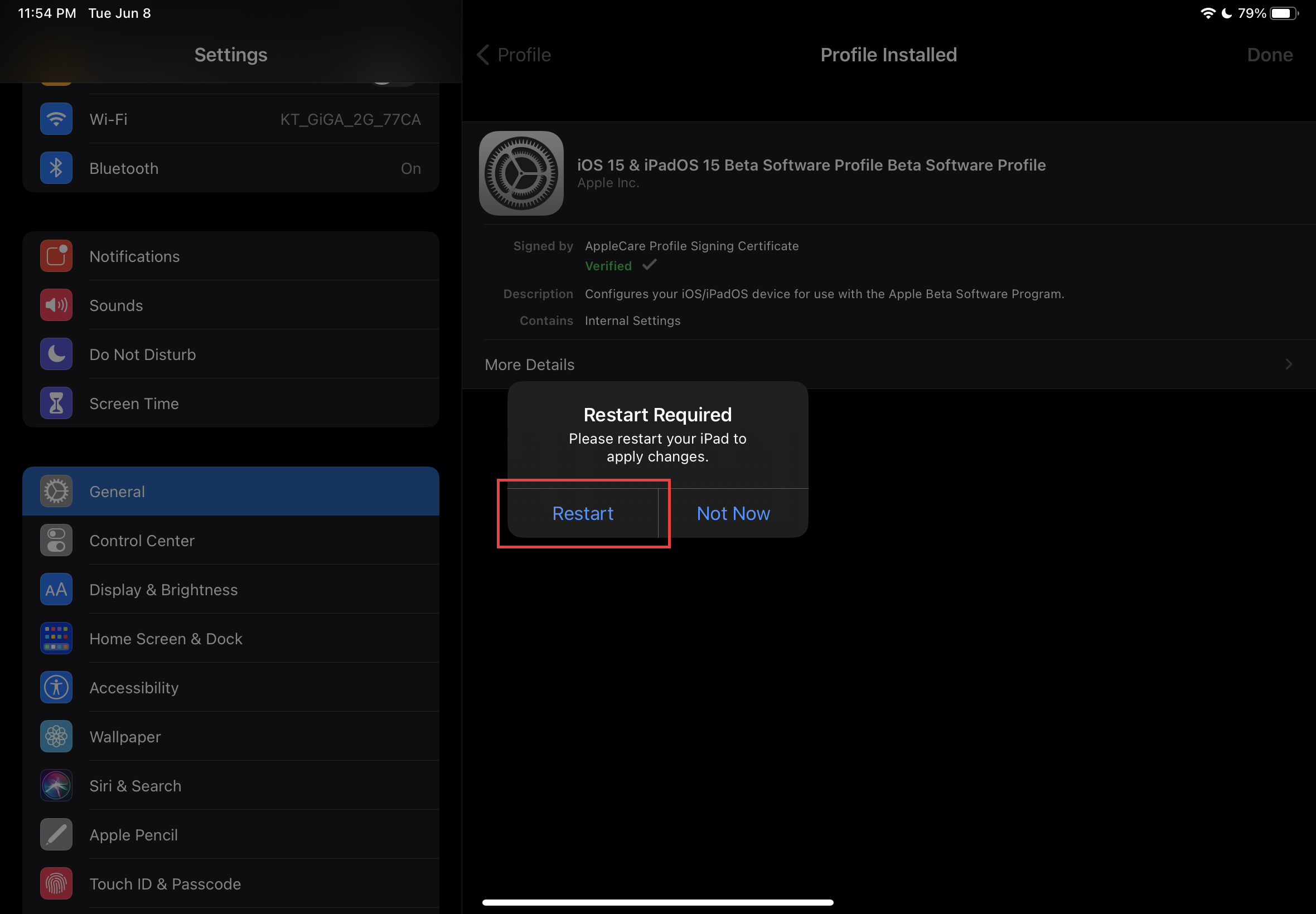 우측 최상단에 있는 'Install' 또는 설치 버튼을 클릭하고, 'Install' 버튼을 클릭한 뒤, 'Restart' 버튼을 클릭하여 아이패드를 재시동합니다. 이 과정까지 진행하였다면 애플 베타를 설치할 준비가 모두 완료되었습니다.