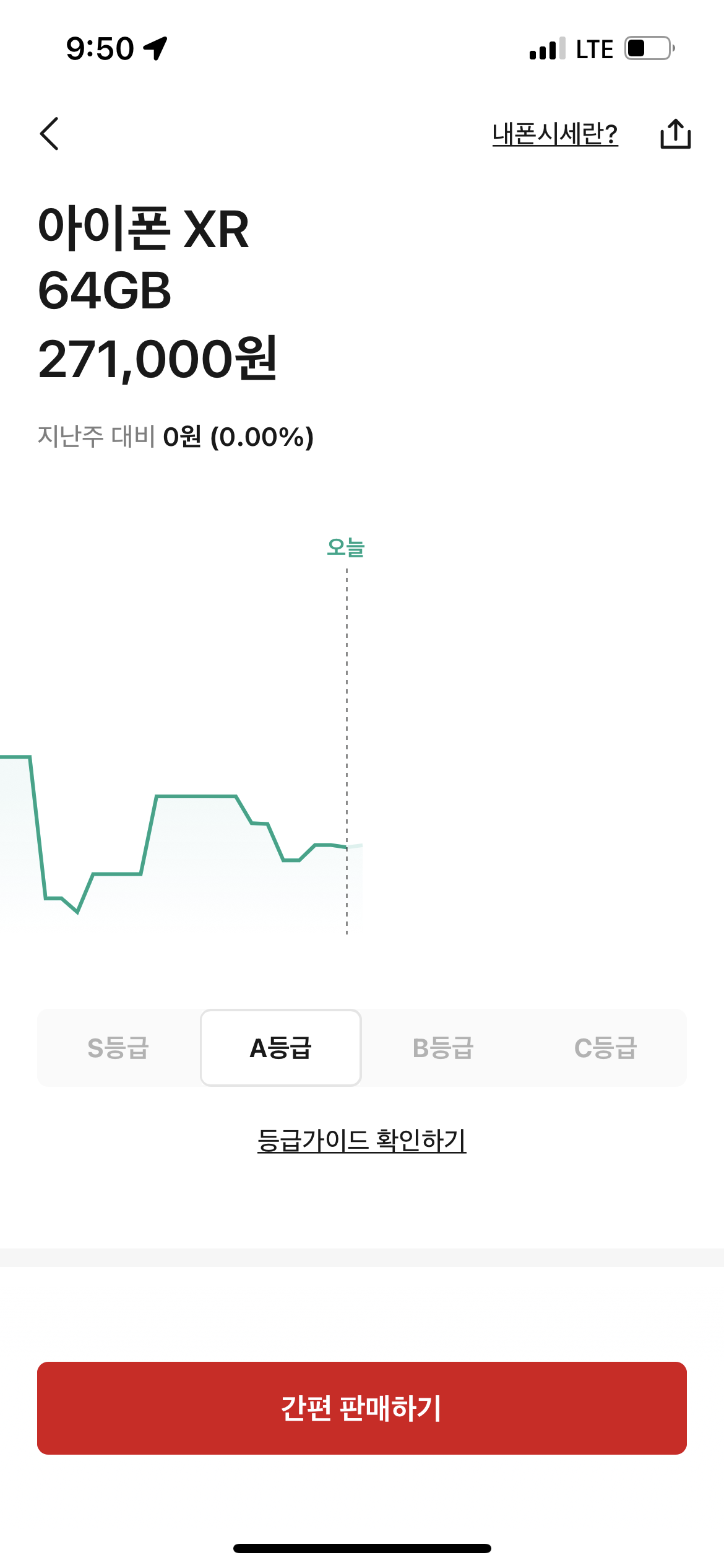 조회해본 결과 S등급은 290,000원, A등급은 271,000원, B등급은 240,000원, C등급은 192,000원으로 시세가 조회되었습니다. 시세가 나쁘지 않다면 '간편 판매하기' 버튼을 눌러 판매 신청을 진행할 수 있습니다.