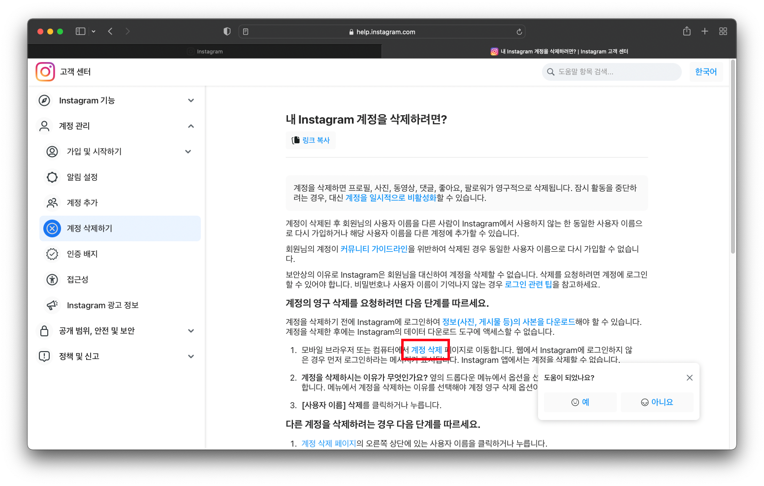 '내 Instagram 계정을 삭제하려면?' 문서가 표시되면, "모바일 브라우저 또는 컴퓨터에서 계정 삭제 페이지로 이동합니다. 웹에서 Instagram에 로그인하지 않은 경우 먼저 로그인하라는 메시지가 표시됩니다. Instagram 앱에서는 계정을 삭제할 수 없습니다." 행을 찾아, 파란색으로 표시된 "계정 삭제" 링크를 클릭합니다.