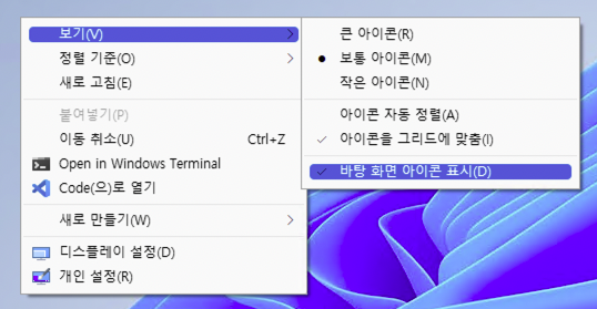 해결 방법은 간단합니다. 윈도우 운영체제의 바탕화면의 빈 공간에서 [보기 - 바탕 화면 아이콘 표시] 항목을 차례로 누르면, 바탕화면 아이콘이 원래대로 표시됩니다.