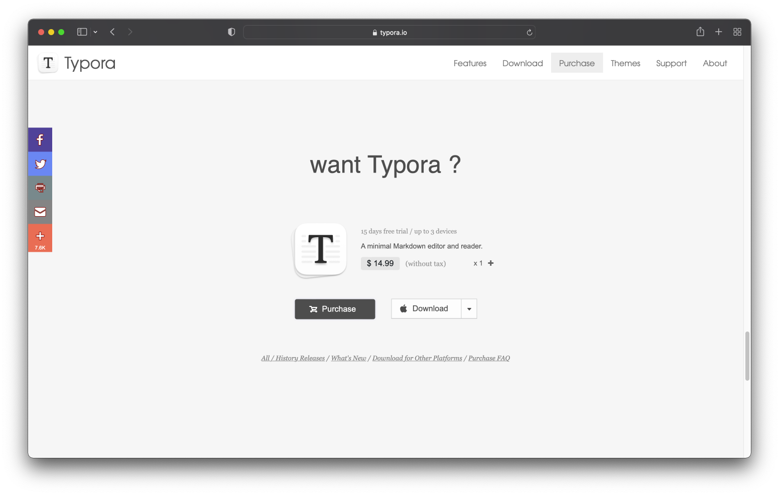 Typora 에디터는, 유로 프로그램으로 15일 동안 무료로 이용할 수 있습니다. Typora는 애플 앱 스토어가 아닌, Typora 공식 웹 페이지에서 다운로드가 가능합니다.